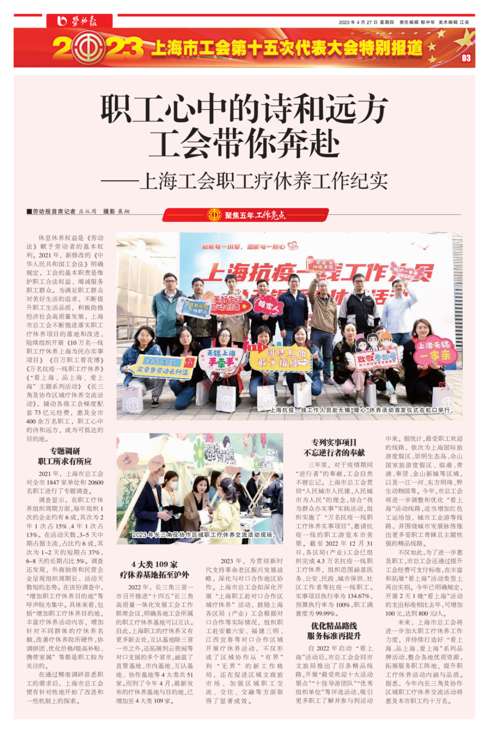 为满足职工群众对美好生活的追求,不断提升职工生活品质,积极助推经济社会高质量发展,上海市总工会不断推进落实职工疗休养项目的落地和改进,陆续组织开展《10万名一线职工疗休养上海为民办实事项目》《百万职工看花博》《万名抗疫一线职工疗休养》《“看上海、品上海、爱上海”主题系列活动》《长三角及协作区域疗休养交流活动》,撬动各级工会梯度配套73亿元经费,惠及全市400余万名职工,职工心中的诗和远方,成为可抵达的目的地。