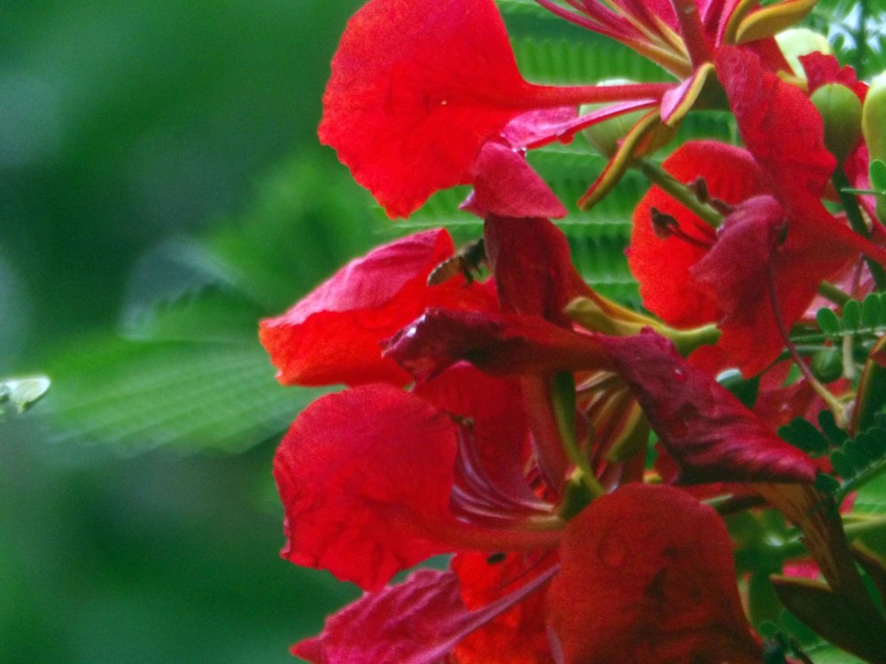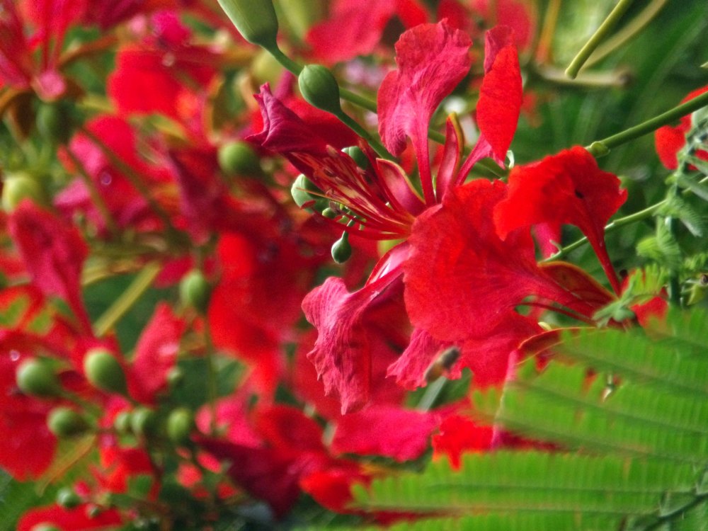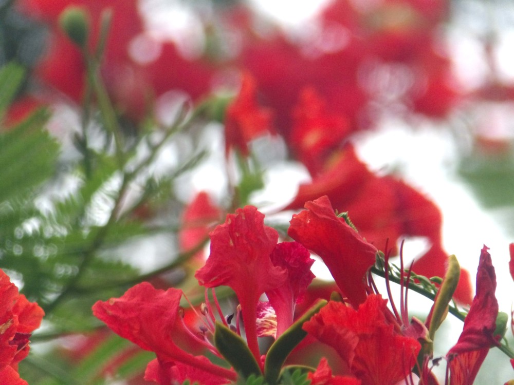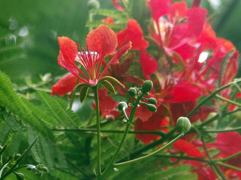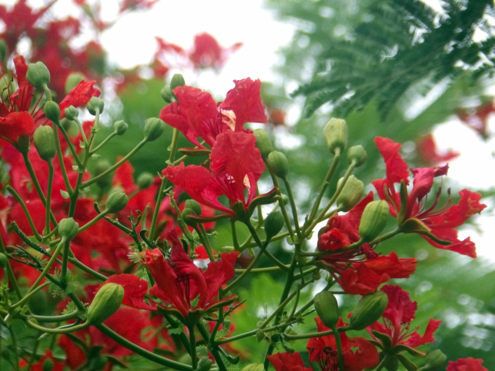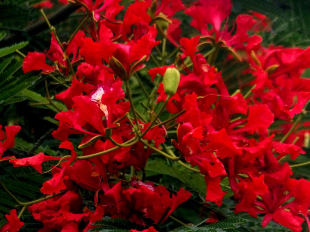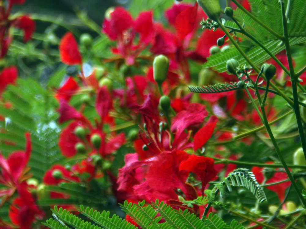 花开时满树结花,火红一片,与绿叶相映成趣。因其叶如飞凰之羽,花若丹凤之冠,故取名凤凰。 凤凰花,花落而其色不褪;花开花落时,枝头地上火红一片其景观甚为壮美。原来凤凰花和凤凰有着同样的凄美壮丽之色彩,叫人怜爱,使人着迷。