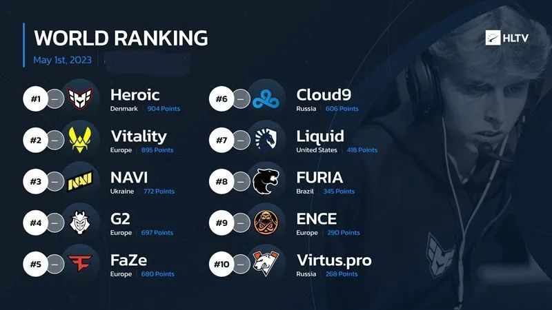 Astralis继续下滑,排名来到第24位。BNE超过Spirit,进入Top20。MOUZ、OG各上升一名。