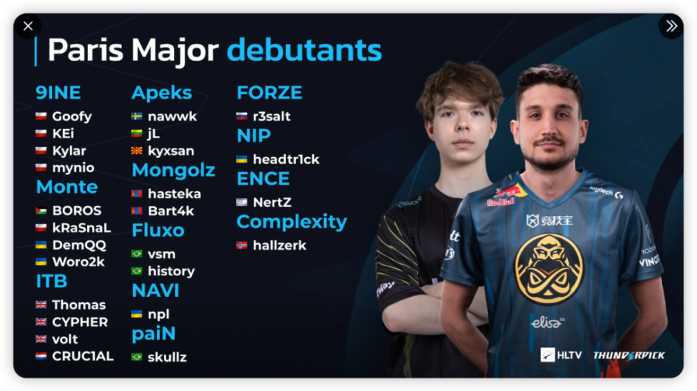 ITB、9INE、Monte三支战队的选手几乎都是首次进行Major比赛。最年轻的选手为17岁的NAVI选手npl,而在22年预测的明日之星选手中只有头套哥与npl成功闯进Major。
