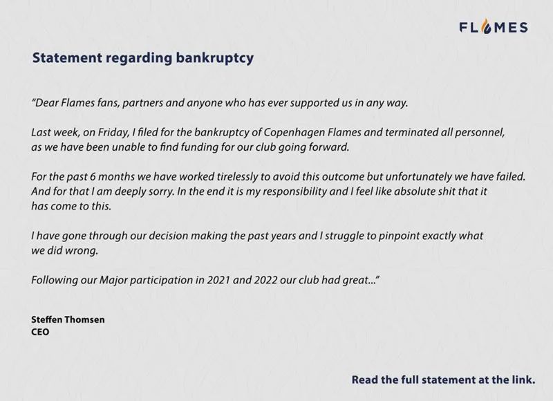 Copenhagen Flames电子竞技俱乐部老板Steffen Thomsen近日正式申请破产。俱乐部在官网发布的一份声明所述,由于未能吸引更多的投资,俱乐部的日常运营将难以为继。