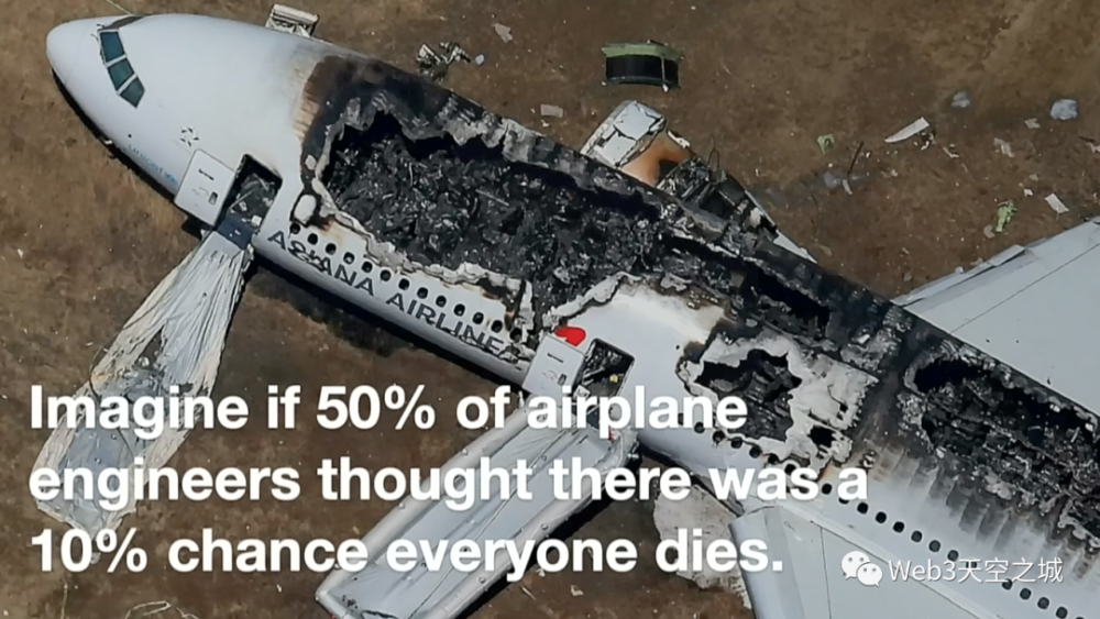 这就像你要上一架飞机,50%的工程师说,如果你上这架飞机,每个人都会坠毁的可能性大于10%, 你会上那架飞机吗?