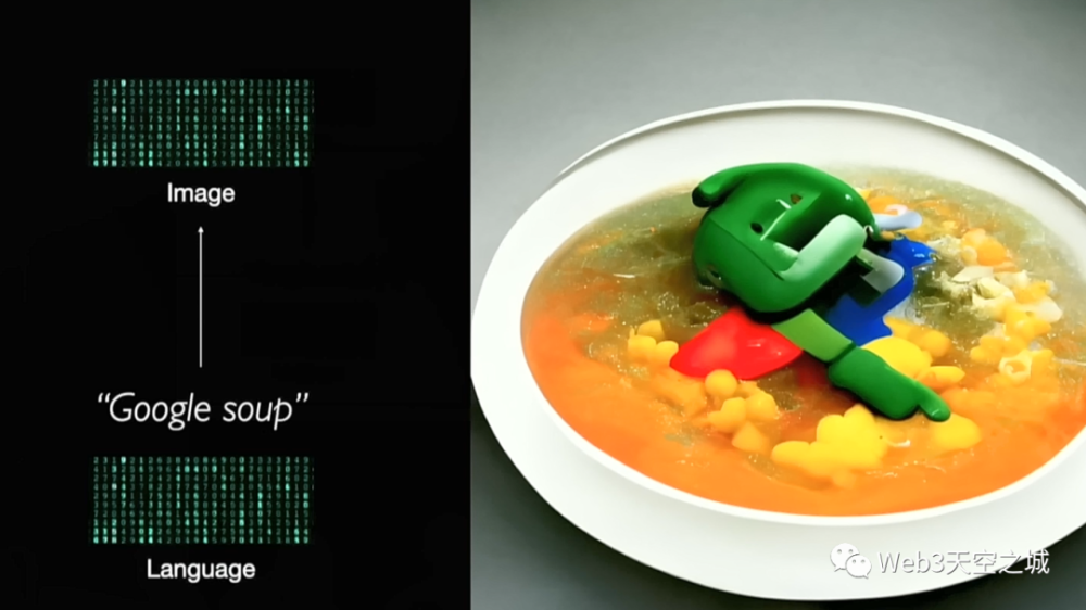 有一个我很喜欢的简单例子“谷歌汤”, 这就是AI返回的语言翻译成图像的结果。
