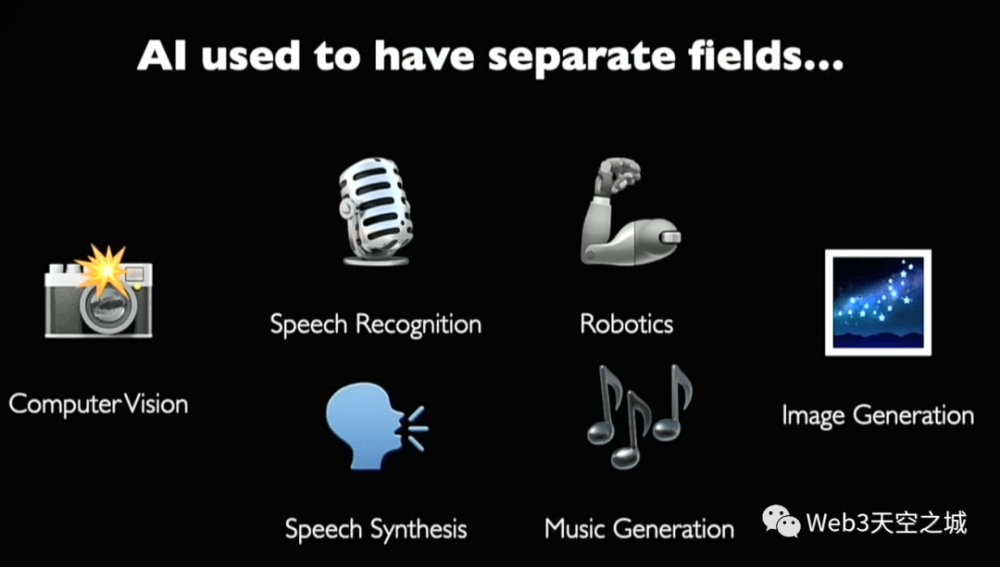 发生了什么事? 过去,我上大学的时候,机器学习有许多不同的学科:有计算机视觉,语音识别,语音合成,图像生成等等;许多学科都是不同的,如果你在一个学科,你真的读不懂其他(AI)学科的论文,有不同的教科书,有不同的教学楼,你会去不同的地方。。。