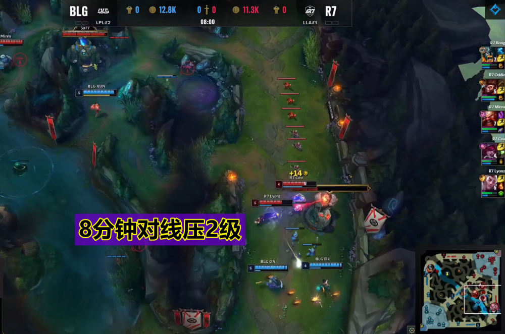 第一局比赛,仅仅8分钟的时候,R7下路AD就被压在塔下,并且等级也被压了2级,并且由于下路被压得太惨,导致打野前期不得不帮忙,可帮了依然打不过,还让自己野区被入侵,就这样第一局R7被BLG给全面打烂。