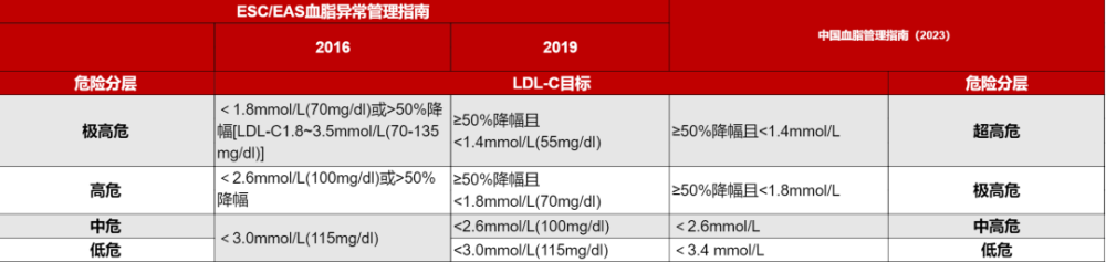 在这一方面,《中国血脂管理指南(2023)》与ESC/EAS不谋而合,尽管对于危险程度的分级方案有所差异,但也对中高危、极高危和超高危的患者提出了与ESC/EAS一致的管理目标(表1)。同时,《中国血脂管理指南(2023)》还提出LDL-C的管理目标应治疗后LDL-C的绝对下降值和治疗对象的基线风险来确定,基线风险越高的患者,LDL-C 目标值则应越低。