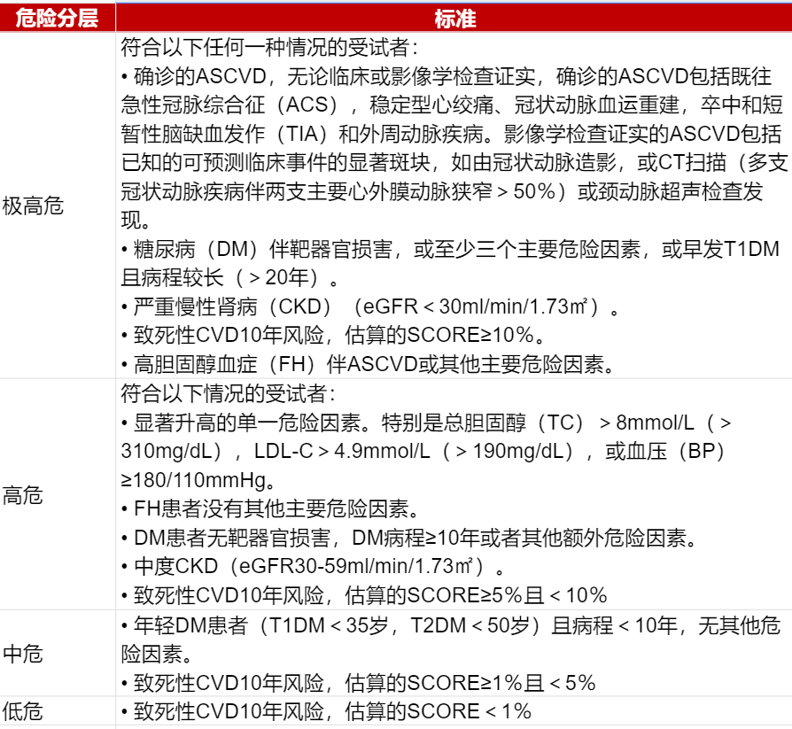 2019 ESC/EAS指南提出,在健康人群中CVD风险通常是多种相互作用的危险因素的结果。目前ESC/EAS指南仍采用传统低、中、高、极高危分级法,危险分层相比2016版指南变得更加明确,高危、极高危人群的定义变得更加宽泛(表2)[2]。