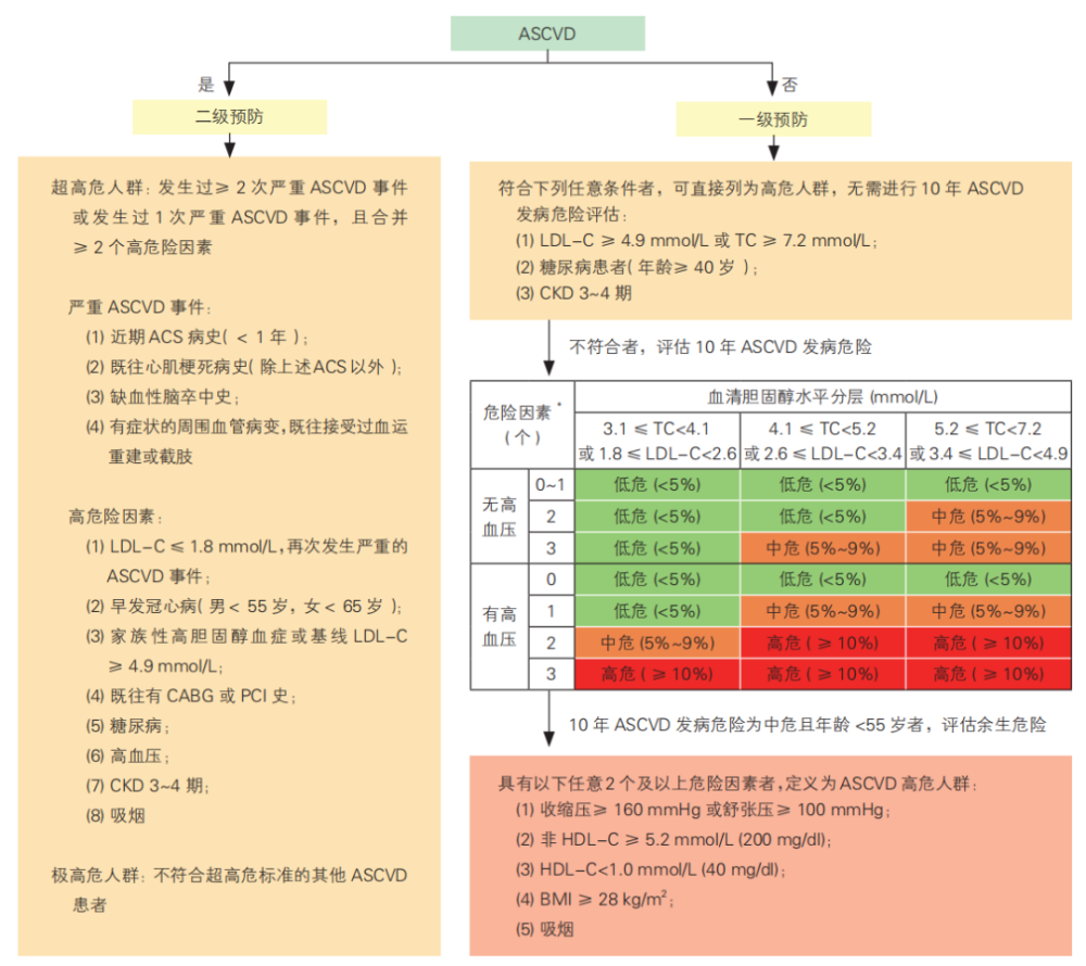 ASCVD:动脉粥样硬化性心血管疾病;ACS:急性冠脉综合征;LDL-C:低密度脂蛋白胆固醇;CABG:冠状动脉旁路移植术;PCI:经皮冠状动脉介入治疗;TC:总胆固醇;CKD:慢性肾脏病;HDL-C:高密度脂蛋白胆固醇;BMI:体重指数。1 mmHg=0.133 kPa。危险因素的水平均为干预前水平。*:危险因素包括吸烟、低HDL-C、年龄≥45/55岁(男性/女性)。