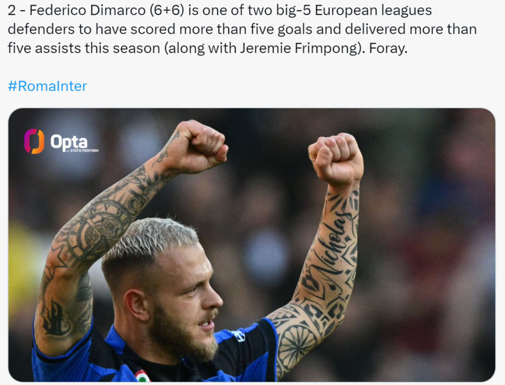 也想提一提另一个球员的纪录:迪马尔科此战取得破门,赛季各条战线的数据是6球6助攻,他也是目前五大联赛里,仅有的2个各线进球5+、助攻5+的后卫(边翼卫)之一(另一个是勒沃库森的弗林蓬)。