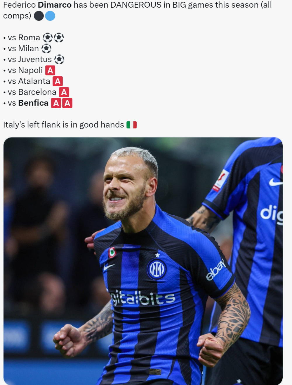时下,在意大利社交网站上,讨论迪马尔科本赛季能击杀几个冠军,成为热点话题。到目前为止,他击杀的榜单里有意甲冠军那不勒斯,有大概率夺取西甲、葡超冠军的巴萨、本菲卡。这个数字还可能继续扩大,不单单是因为罗马、尤文等队还有冲击欧战冠军的希望,也是因为,国米后续还有不少强敌要碰。