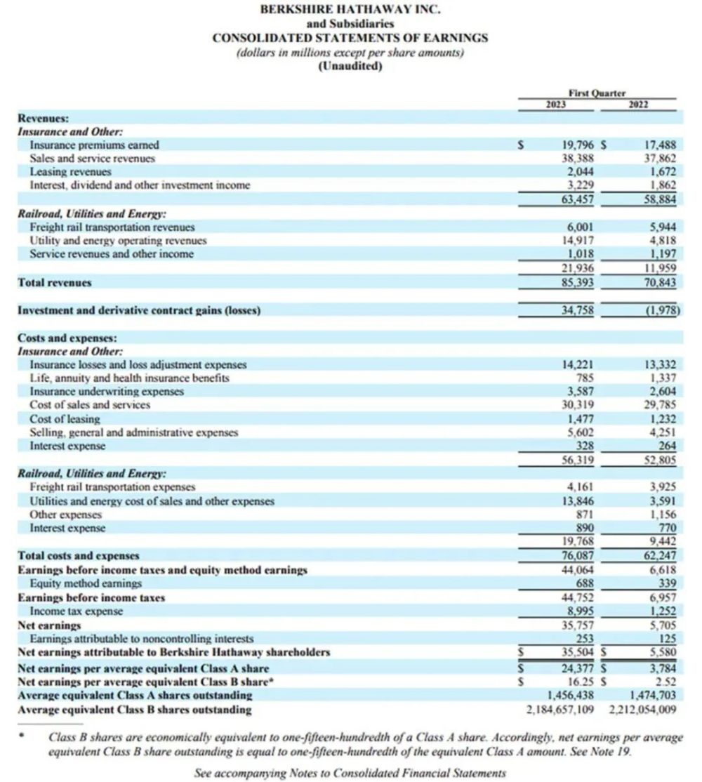 按照惯例,在一年一度的巴菲特股东大会召开前夕,伯克希尔·哈撒韦公布了2023年第一季度财报。报告显示,一季度公司实现净利润355.04亿美元(约合人民币2453亿元),去年同期为55.80亿美元(约合人民币386亿元);第一季度营收853.93亿美元,去年同期为708.43亿美元;第一季度投资和衍生品收益为347.58亿美元,去年同期为亏损19.78亿美元。