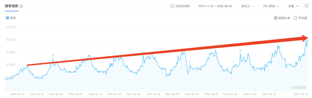 从百度指数中可以看到,湿疹不仅夏季高发,随着时间推移,患有湿疹的人群还越来越多!