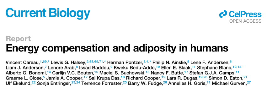 [1]Careau V, Halsey LG, Pontzer H, Ainslie PN, Andersen LF, Anderson LJ, Arab L, Baddou I, Bedu-Addo K, Blaak EE, Blanc S, Bonomi AG, Bouten CVC, Buchowski MS, Butte NF, Camps SGJA, Close GL, Cooper JA, Das SK, Cooper R, Dugas LR, Eaton SD, Ekelund U, Entringer S, Forrester T, Fudge BW, Goris AH, Gurven M, Hambly C, El Hamdouchi A, Hoos MB, Hu S, Joonas N, Joosen AM, Katzmarzyk P, Kempen KP, Kimura M, Kraus WE, Kushner RF, Lambert EV, Leonard WR, Lessan N, Martin CK, Medin AC, Meijer EP, Morehen JC, Morton JP, Neuhouser ML, Nicklas TA, Ojiambo RM, Pietil?inen KH, Pitsiladis YP, Plange-Rhule J, Plasqui G, Prentice RL, Rabinovich RA, Racette SB, Raichlen DA, Ravussin E, Reilly JJ, Reynolds RM, Roberts SB, Schuit AJ, Sj?din AM, Stice E, Urlacher SS, Valenti G, Van Etten LM, Van Mil EA, Wells JCK, Wilson G, Wood BM, Yanovski J, Yoshida T, Zhang X, Murphy-Alford AJ, Loechl CU, Luke AH, Rood J, Sagayama H, Schoeller DA, Wong WW, Yamada Y, Speakman JR; IAEA DLW database group. Energy compensation and adiposity in humans. Curr Biol. 2021 Oct 25;31(20):4659-4666.e2. doi: 10.1016/j.cub.2021.08.016. Epub 2021 Aug 27. PMID: 34453886; PMCID: PMC8551017.