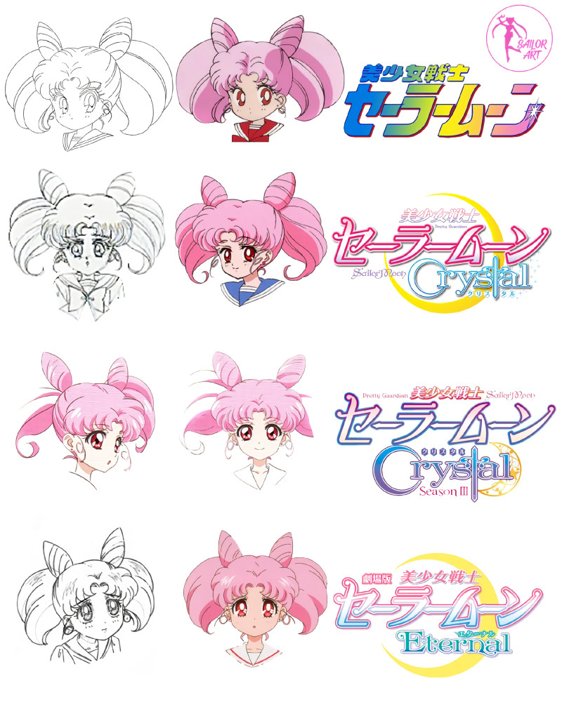 第四版的月野兔则是有着更加明显的变化,可以发现一个明显的趋势,就是月野兔的眼睛变得越来越大。