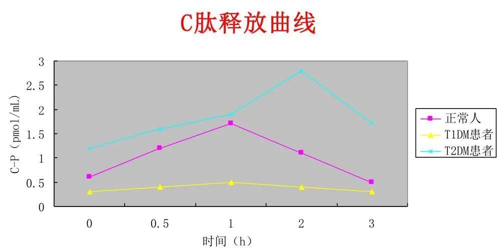 在口服葡萄糖耐量试验的同时可抽血测定空腹血糖负荷后1小时、2小时、3小时的血清C肽水平,正常人在服糖60分钟后C肽水平升高至基础水平的3倍以上。1型糖尿病C肽水平极低(<0.2nmol/L),胰岛功能减退者餐后C肽上升的幅度常低于3倍。对于接受胰岛素治疗的患者,用测定血中胰岛素水平不能评价自身胰岛功能,可以测定C肽水平来评价自身胰岛β细胞功能。