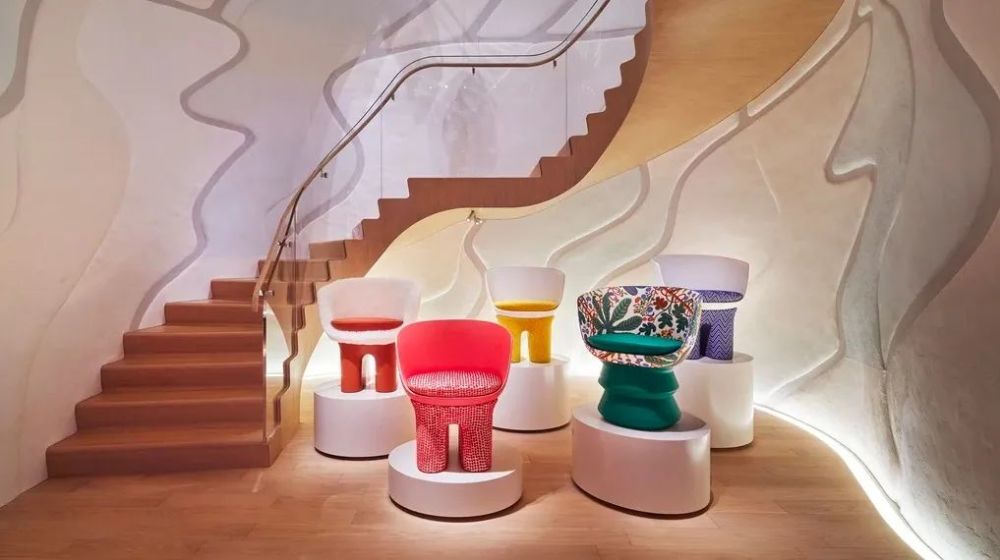 皮埃尔·保林(Pierre Paulin)和斯蒂芬·利奥(Stephen Leo)的家具带来多彩印象,四层的墙面则是对藤村公子(Kimiko Fujimura)的画作“波浪蓝线”(Wave Blue Line)的重新诠释,增添了商店的活力。