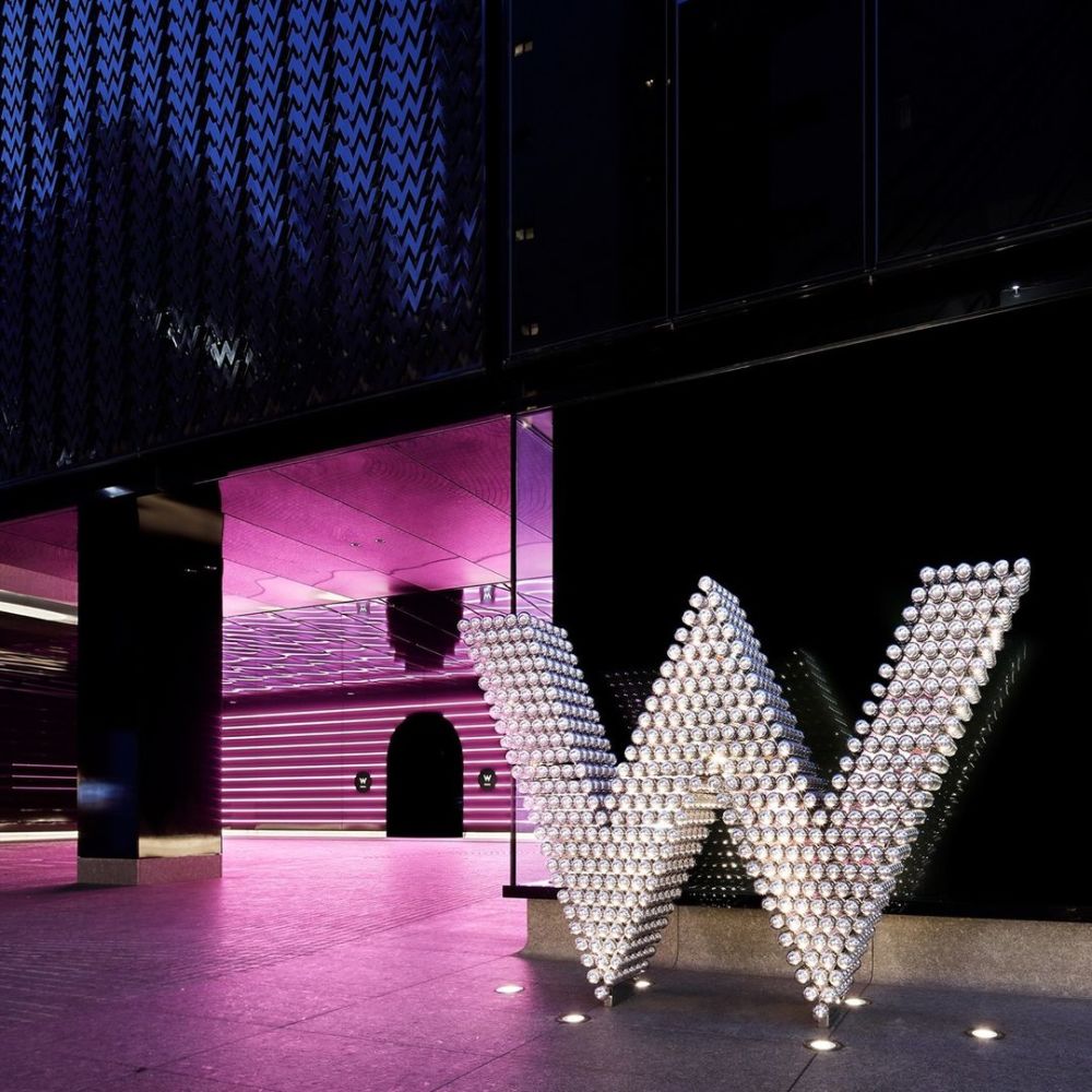 夜晚十分,酒店门口紫红色的灯光从内部倾泻而出,标志性的W如钻石版闪耀,高调抢眼。