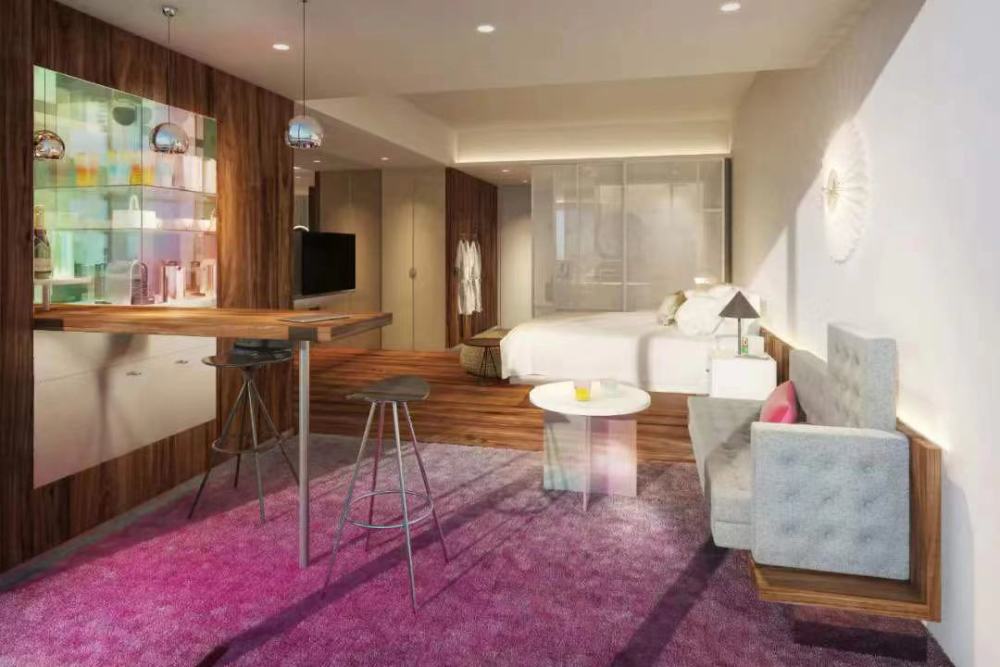 酒店内有337间客房,色彩明亮;普通客房约2500-3000元人民币一晚,而面积约为200㎡的顶层套房,住上一晚费用高达约6万,这里不仅有餐厅、厨房、客厅,还有一个DJ台,会打碟的潮人可以自由发挥了。