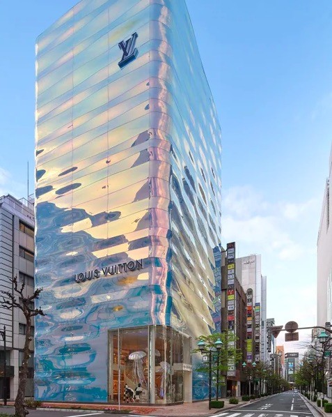 大楼外观呈现出波动水漾的感觉,灵感来源于东京湾的水面波浪,让人联想到“水柱”。双曲面玻璃与二向色膜的使用,令建筑体在自然光线的作用下充满变化。
