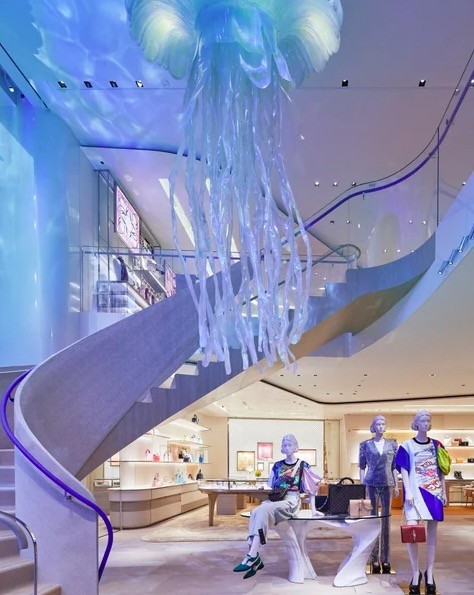 商店入口大门颇具气势,进入之后映入眼帘的便是巨大的水母装饰,灵动自由,呼应着大楼外立面的设计感。