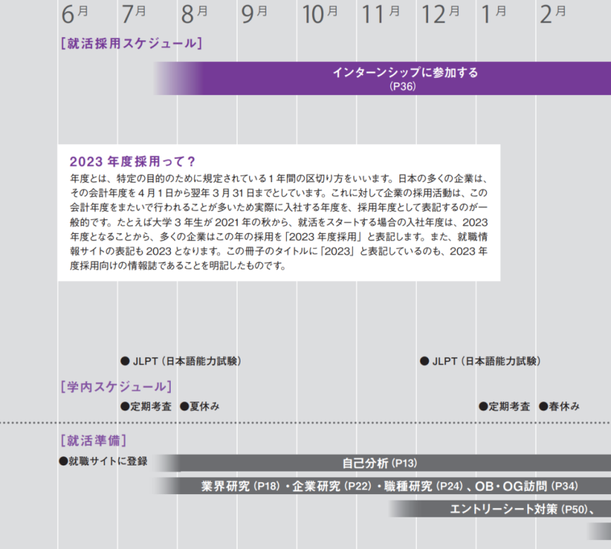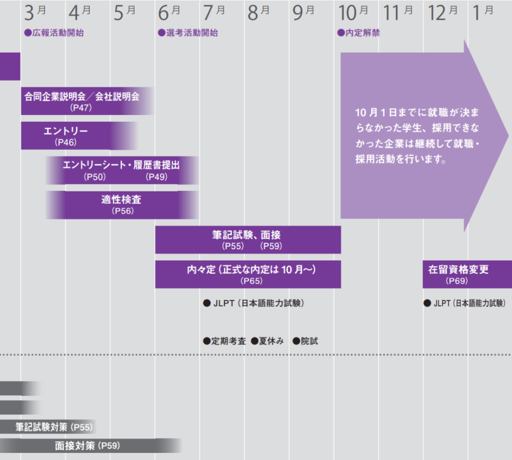 世界上很多国家都是9月开学,但日本的大学或专门学校则多是4月开学,3月毕业。因此在日本,3月毕业的学生将从第二个月的4月1日开始入职工作。在日本的外资企业和日本企业大多会根据同样的日程表开展录用活动。而且与国外相比,日本就职活动开始较早。