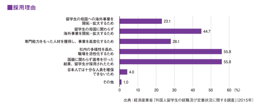 关于这个问题Jasso给出了官方回答,下图就是关于企业招聘留学生的理由总结。排在前三位的理由是: