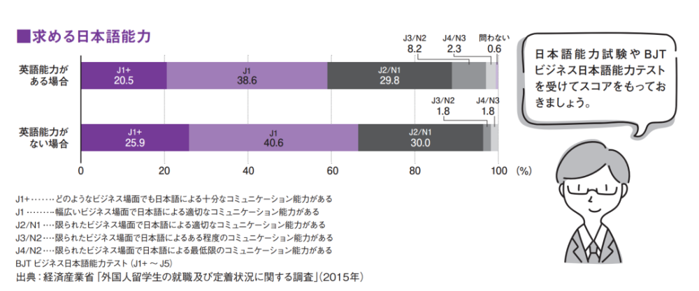 在留学生的就业活动中,企业最关注的能力就是日语能力。相比于大学在招生时注重日语能力,企业在招聘时更注重口语能力,能够说好商务用语的求职者会受到企业更多的青睐。