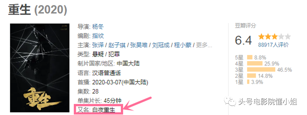 不过,《重生》的节奏相对比较慢热,并没有等来预期中的口碑大爆,豆瓣开分8分,后来评分下滑到6.4分,没有延续《白夜追凶》的大爆姿态。