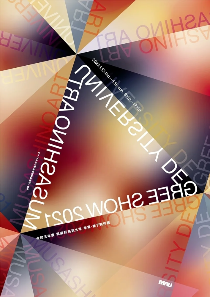 武藏野的海报是由2008年毕业于视觉传达设计系的三上悠里设计,画面好似一面折射出多重光彩的棱镜,色块边缘是镜面翻转的文字。