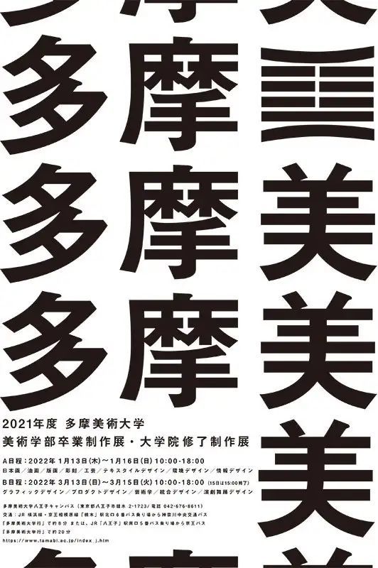 多摩美术大学今年的海报特别直白,满屏的“多摩美”三个大字让人联想到“重要的事情要说三遍”,清晰明了让人记忆深刻。