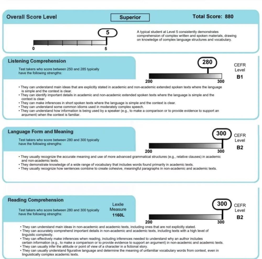 小冰注:几年前,剑桥考试逐渐“销声”后,小托福考试成了大家检测孩子英语水平的热门选择。花友孩子小托福考了880分,相当于FCE优秀通过的水平了;语用和阅读满分,相当厉害