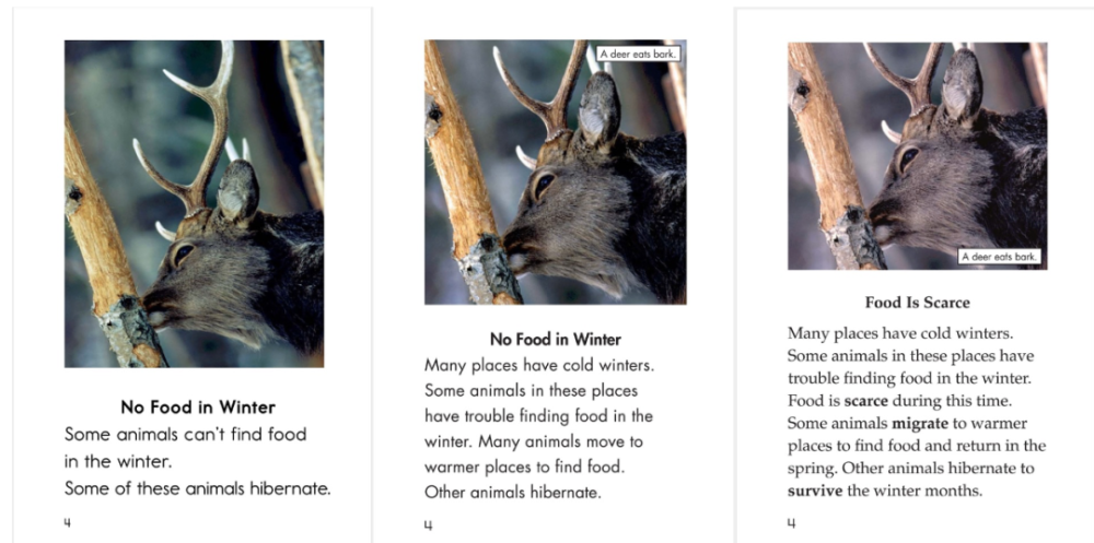 从左到右,分别是RAZ F级别、I级别、M级别关于“冬眠”的内页,可以看出难度的螺旋上升
