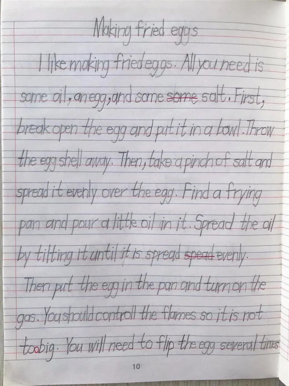 我发现可能是因为听的英文故事太多的原因,随便一件小事,譬如做鸡蛋饼,他都能洋洋洒洒写上一大篇(我们没有上过任何英文写作课)。