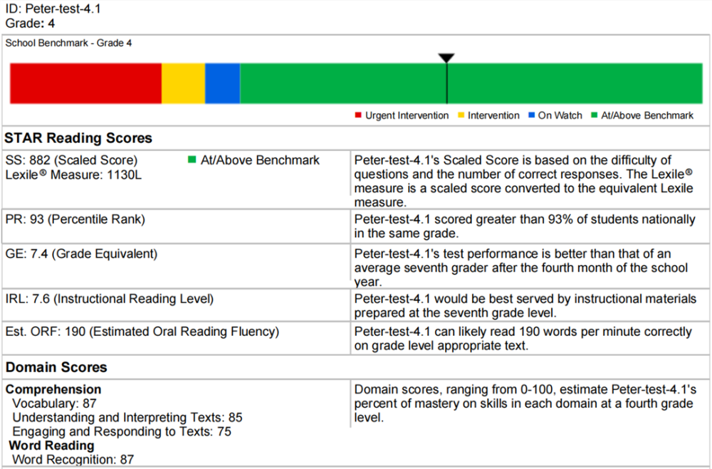 注:图片中还有一个数值值得关注:GE值,GE(Grade Equivalent):是STAR测试报告中,最被常用的数值,评估阅读水平处于美国学生的年级数值,范围为K~12.9。比如?上图的GE 值为 7.4 ,表示被测试者和美国七年级第4个月学生的平均阅读水平相当。