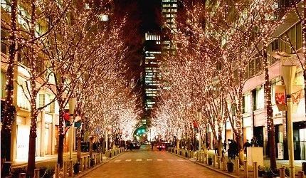 东京车站附近、连接有乐町、大手町等区域,长达1.2km的「丸の内仲通り」上,两排约200多棵路树挂满了超过一百万颗香槟金色的LED灯饰,且所有灯泡的电力来源皆来自于天然的太阳能、风力发电等。为城市营造出浪漫圣诞气氛的同时,也不忘环保与爱护地球的思维,非常有日本人的风格。