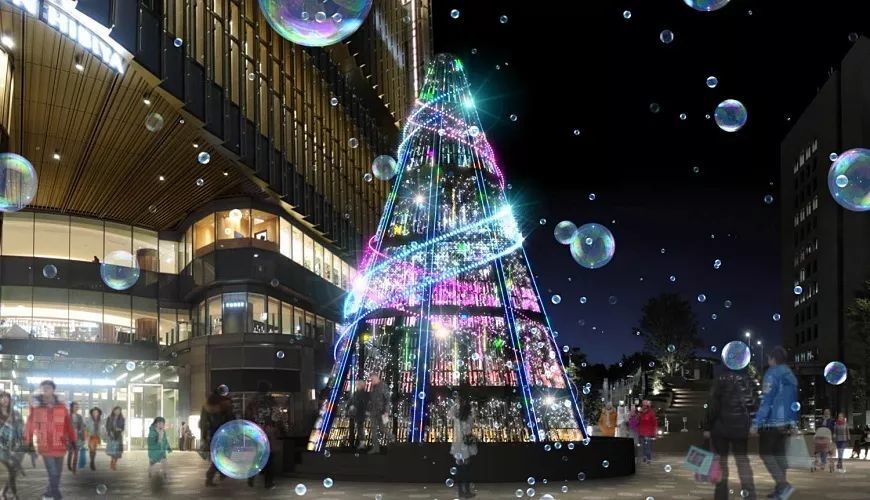 时尚街区表参道的代表性商场「表参道Hills」,今年的圣诞灯饰由前卫设计工作室「we+」所规划设计,以「水之魔法的诱惑」为主题,将40个特殊构造水箱组成巨型圣诞树,巧妙利用吸水性材质以及水位的变化,让圣诞树外观呈现如梦似幻的形色变换,搭配音乐与灯光的共演,气氛既前卫又浪漫!