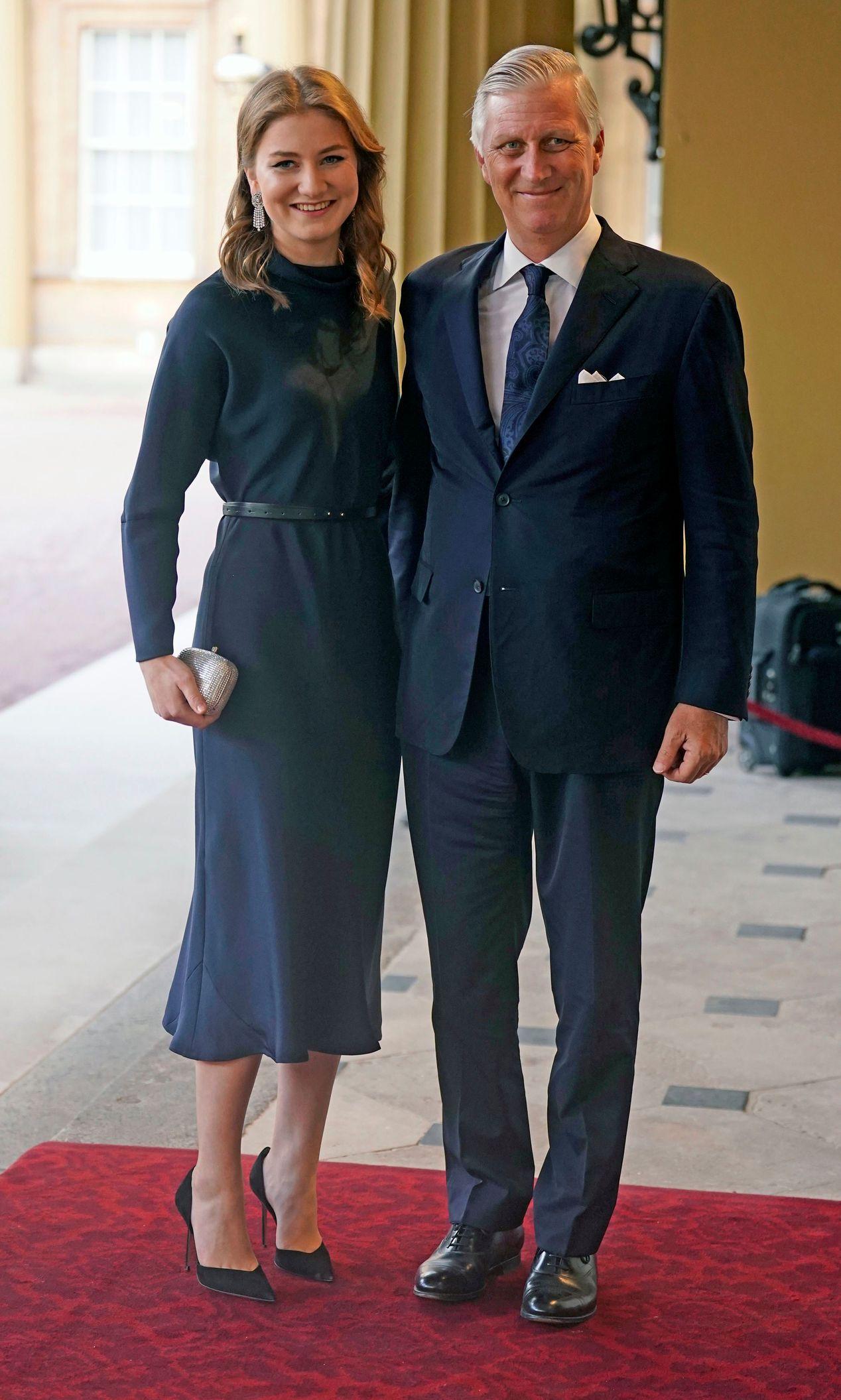 未来将成为比利时王室第一位女王的伊莉莎白公主(Princess Elisabeth),21岁的她目前正在英国牛津大学学习历史和政治,她在父亲菲利普国王(Philippe Léopold Louis Marie)陪同下,一起出席晚宴,伊莉莎白穿着亚曼尼(Giorgio Armani)海军蓝连身裙,腰上系着黑色皮带、穿着黑色高跟鞋,并以耀眼的钻石垂坠耳环、银色手拿包增添奢华气息。