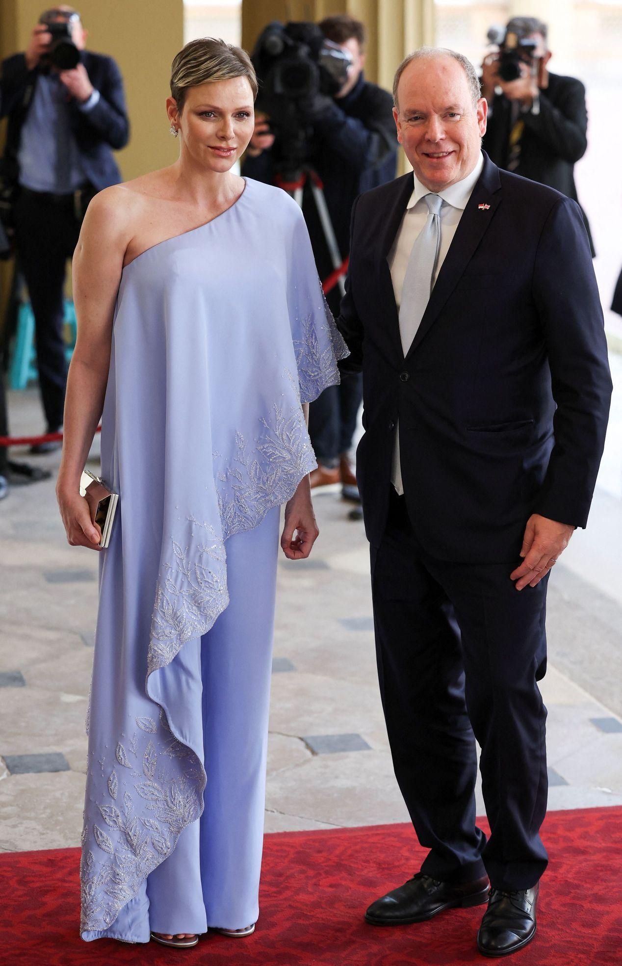 除了「准女王」们相当吸睛,摩纳哥「美人鱼」王妃夏琳亲王妃(Charlene Wittstock)也陪着丈夫阿尔贝二世亲王(Albert II)出席,破除两人婚变传言,夏琳亲王妃穿着浅蓝色系单肩上衣、宽裤,上衣有着不对称下摆和精致的刺绣,搭配宝石配件点缀,看起来非常高贵优雅,阿尔贝二世亲王也以浅蓝色领带呼应妻子的穿搭。