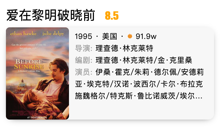 这是一部浪漫的电影,通篇的对白,不停地走动,却让你并不觉索然无味,相反,有时你也会把自己代入进去,去体验了这梦幻般的相遇。