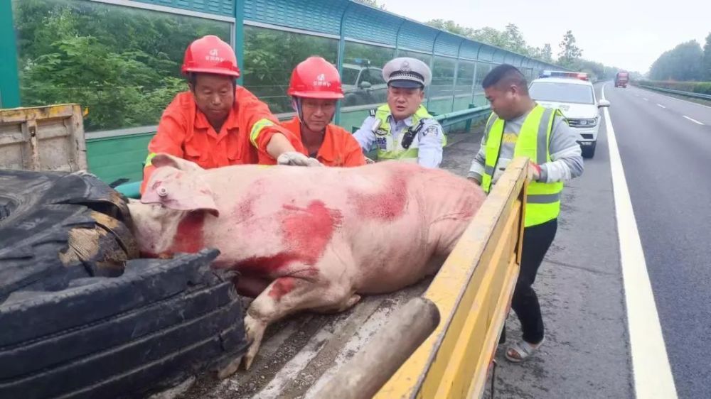 接警后,大队立即联系附近巡逻民警和养护作业人员前往处置。在济广高速往阜阳方向658公里处,养护人员先行发现一头猪正趴在行车道上,过往车辆纷纷向两边躲避,民警立即指令养护人员迅速将猪转移至应急内等待并做好安全防护。民警到达现场后,发现生猪四肢受伤,无法行走,随即联系货车驾驶员告知生猪跌落位置和受伤情况,让驾驶员放心以便安心驾驶,同时要求驾驶员在前方寻找安全地带停车等待民警送猪。