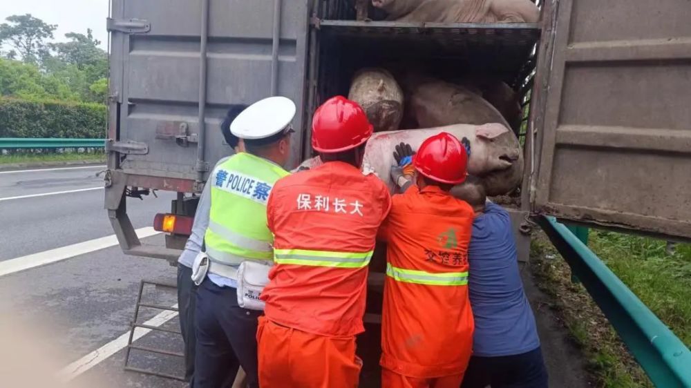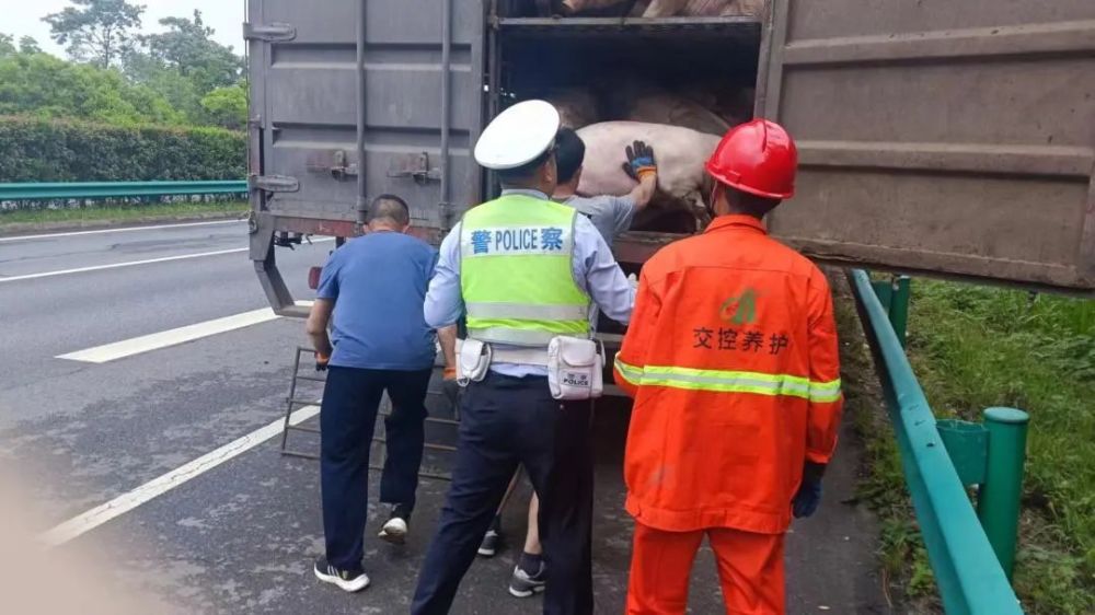 随后,民警协同养护人员,将猪抬上养护车辆,并驾驶警车在后方预警,顺利将跌落生猪“护送”至驾驶员车前。交谈中,驾驶员表示货车分为三层,掉落的这头猪是在最上层拱开铁门掉下去的。了解情况后,民警赶紧和驾驶员准备将猪从养护车辆卸下并抬上运猪货车,可是由于生猪掉落时受伤,且货车货箱较高,经过几番努力,没能将生猪抬进货车,此时民警连忙叫来预警的养护人员,人多力量大,在费了九牛二虎之力后,终于将生猪顺利送进“铁笼”。