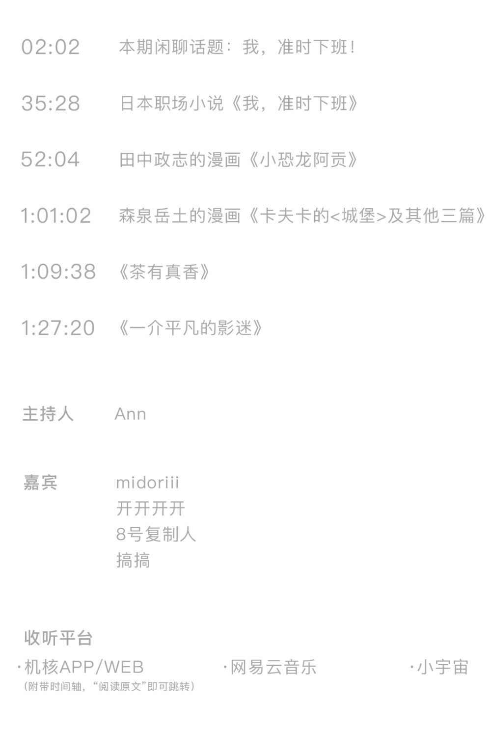 本期闲聊话题:我,准时下班!本期推荐书目:知名日剧原著《我,准时下班》(1-2册),田中政志的漫画《小恐龙阿贡》,森泉岳土的漫画《卡夫卡的