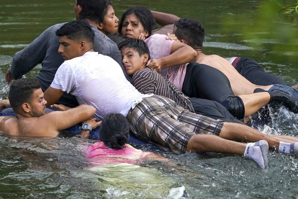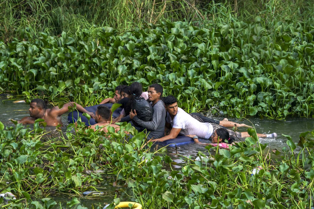 当地时间5月9日,墨西哥马塔莫罗斯,偷渡客躺在充气床垫上穿过布拉沃河进入美国。