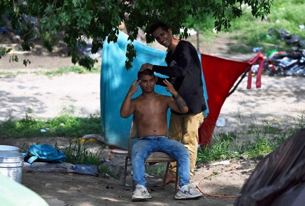 当地时间5月9日,墨西哥马塔莫罗斯,格兰德河岸边的临时营地里,一名男子在理发时向镜头挥手。