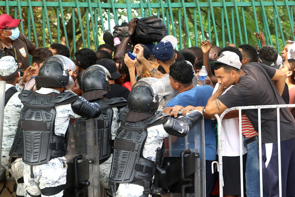 当地时间5月5日,墨西哥恰帕斯州塔帕丘拉,大批移民排队等待办理移民文件。
