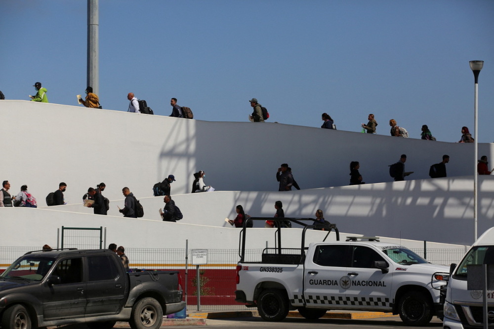 当地时间5月9日,墨西哥蒂华纳,在官方入境口岸申请庇护的移民穿越入境口岸入美。