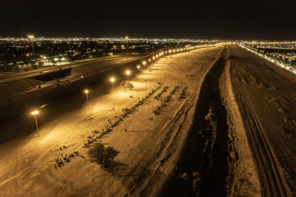当地时间2023年5月9日,墨西哥华雷斯,移民在格兰德河岸边,等待得州埃尔帕索边境巡逻队进行处理。