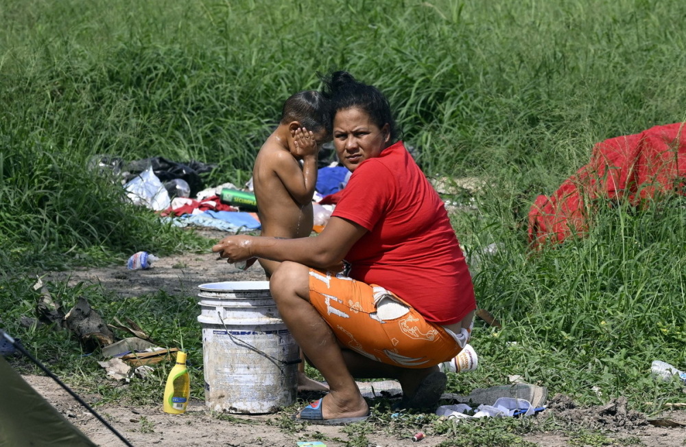 当地时间5月9日,墨西哥马塔莫罗斯,一名妇女在格兰德河岸边的临时营地里给孩子洗澡。