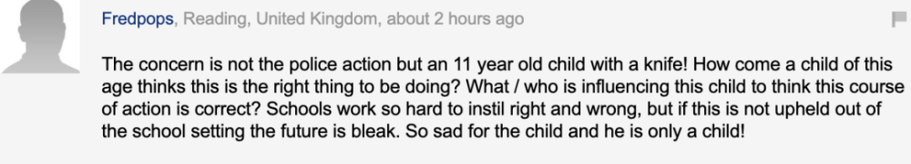 还有一位网友称,“关注的重点不是警方的行动,而是一个11岁的孩子手持刀具!为什么这么小的孩子认为这是正确的做法?是什么在影响孩子认为这条路是正确的?学校非常努力地灌输对与错的观念,但如果在校外环境中无法得到维护,那未来将很黯淡。对于这个孩子来说,真的很悲哀,他只是一个孩子!”