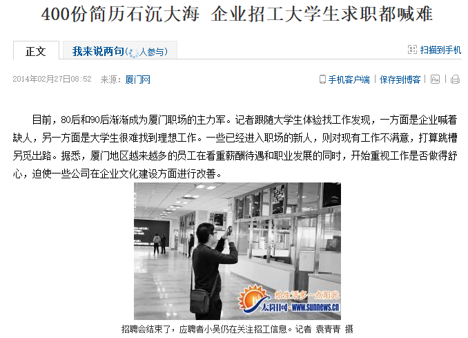2014年的春招,搜狐曾刊载一篇文章,说有应届生投出400份简历都石沉大海了。